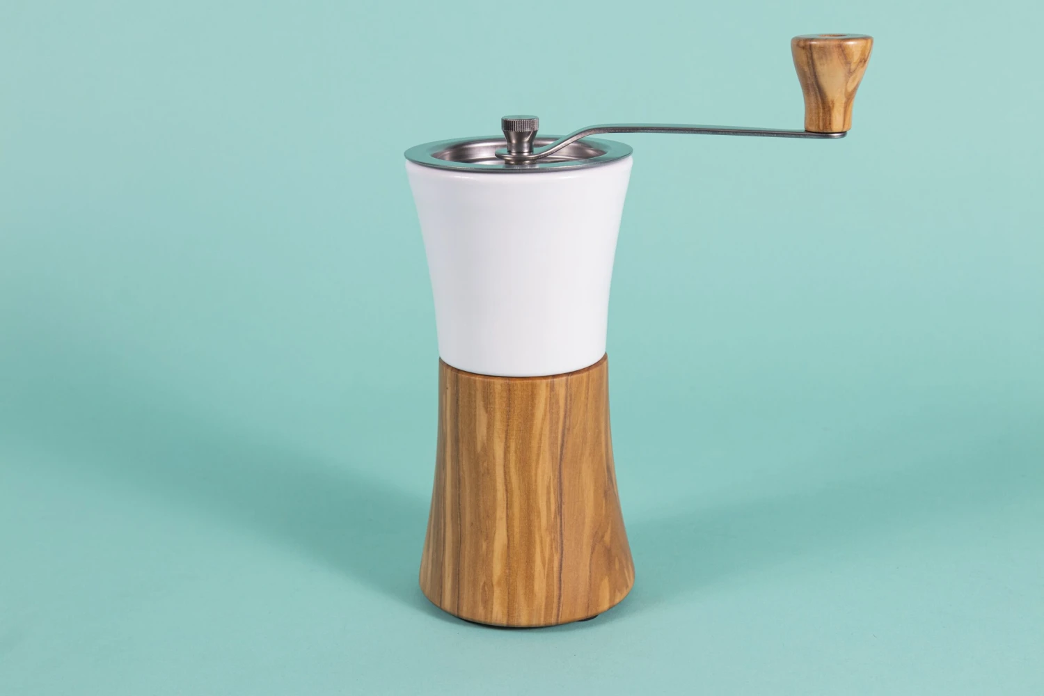 This ceramic and olive wood hand mill is a beautiful device worthy of display in the finest kitchen. The finishes on this grinder offer an elevated look while still being functional. This grinder features glossy white ceramic, a warm toned natural wood and modern stainless steel accents.
