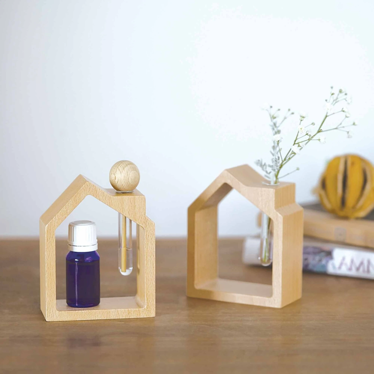 This little house diffuser is perfect for adding whimsy to any space. The chimney holds a small vile for essential oil that can also be used to hold a tiny flower arrangement or a single flower bud.